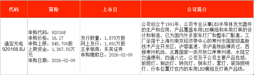 从时间表看,通宝光电(920168)在本周一(2月9日)申购。