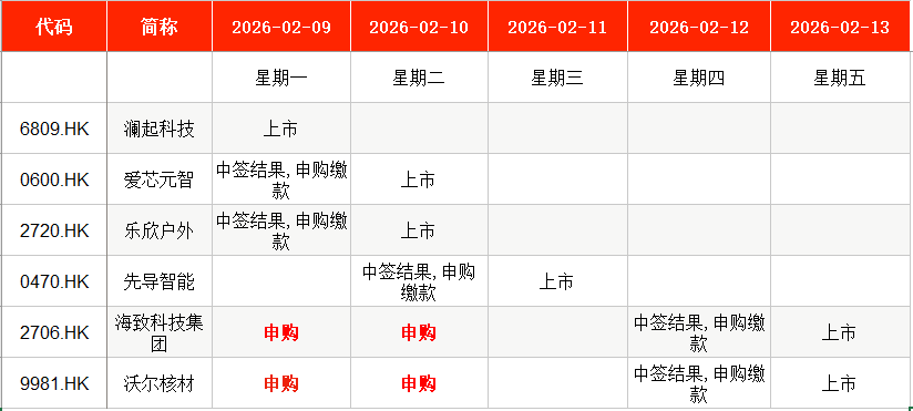 港股方面,Wind数据显示,本周(2月9日至2月13日),海致科技集团(02706.HK)、沃尔核材(09981.HK)等均将在本周一至本周二申购。