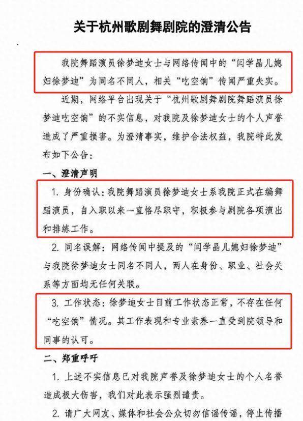 主要是杭州歌剧院有个叫徐梦迪的有“铁饭碗”,而徐女士却总跟着婆婆直播带货,不去公演。大家对此格外反感,将对闫女士的反感转嫁到了她身上,很快歌剧院也作出了回应。